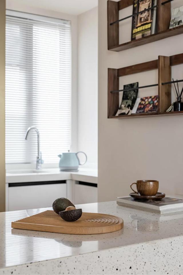 酒吧台的侧墙上,安置了两组胡桃木书架,也可动作展现区来运用,轻快收纳房东订阅的期刊和保藏的手办。