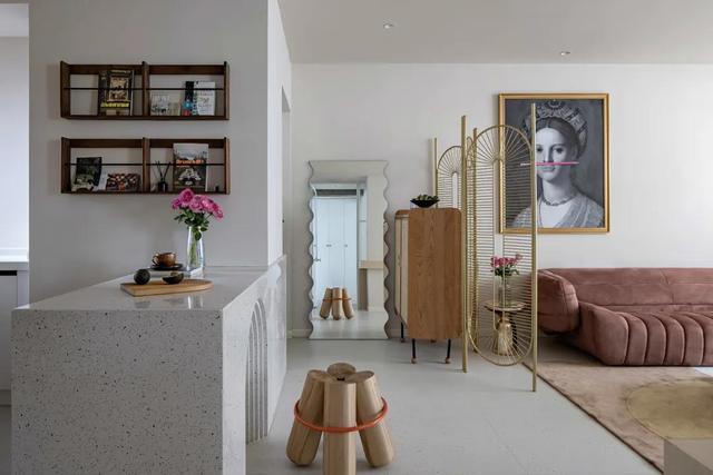 入户门的左侧,摆放了一个涟漪边框的哈哈镜,既能简单房东外出前整治相貌,又能起到夸大空间感和化妆房子的效率。