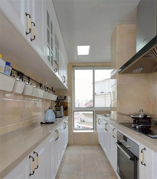 如果家里厨房属于狭长形规格的,可以直接设计成一字型,上下做连排储物柜,将油烟机和燃气灶都做嵌入式设计,整体空间视觉效果更大,更整洁。